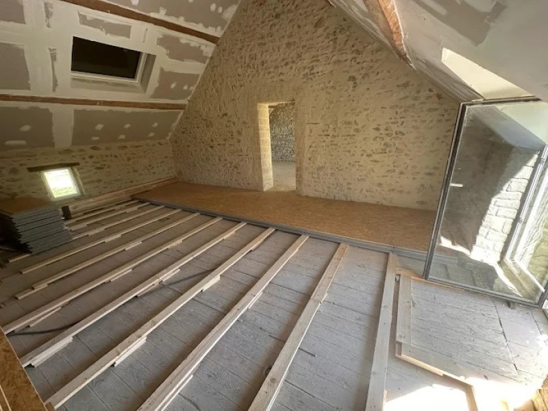 La première étape de ce chantier d'aménagement de combles a été le renforcement de son isolation. Nous avons pour cela effectué la pose d'isolants sous les rampants afin de limiter au maximum les déperditions de chaleur. Cela a permis de considérablement gagner en confort thermique. Après cela, nous avons ensuite installé des plaques de plâtre en veillant à ce qu'elles soient parfaitement agencées entre les pannes de la charpente traditionnelle, laissées visibles.