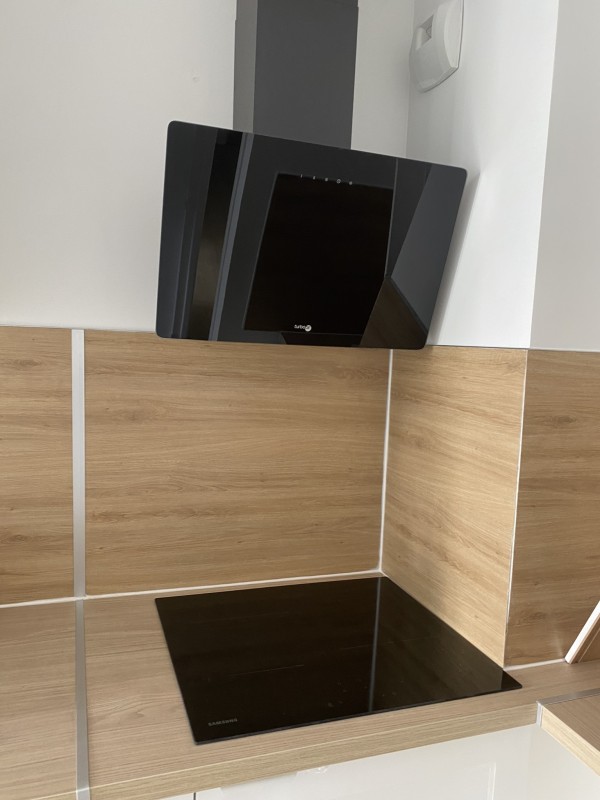 L'étape suivante a été le montage et la pose des meubles et équipements de cuisine. Nos équipes ont installé un plan de travail en bois stratifié pratique et résistant, des placards hauts et bas offrant davantage d'espace de rangement, une hotte aspirante ainsi qu'un four et une table de cuisson encastrés performants. Nous avons également installé un évier noir en céramique, s'accordant harmonieusement avec le reste de la cuisine. Concernant la crédence, nous avons mis en place un revêtement stratifié à motif noyer clair, facile à nettoyer. L'agencement de l'ensemble de ces nouveaux éléments a permis de redonner de la fraîcheur à la cuisine, grâce à une esthétique à la fois chaleureuse et épurée.